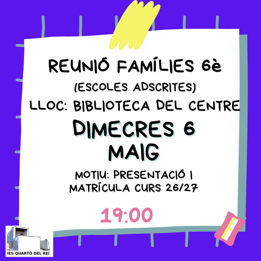 Us recordem que dilluns 27.04.2026 es duran a terme, via Google Meet, les reunions informatives per la tria d’itinerari docent i assignatures optatives pel curs escolar 2026-27.